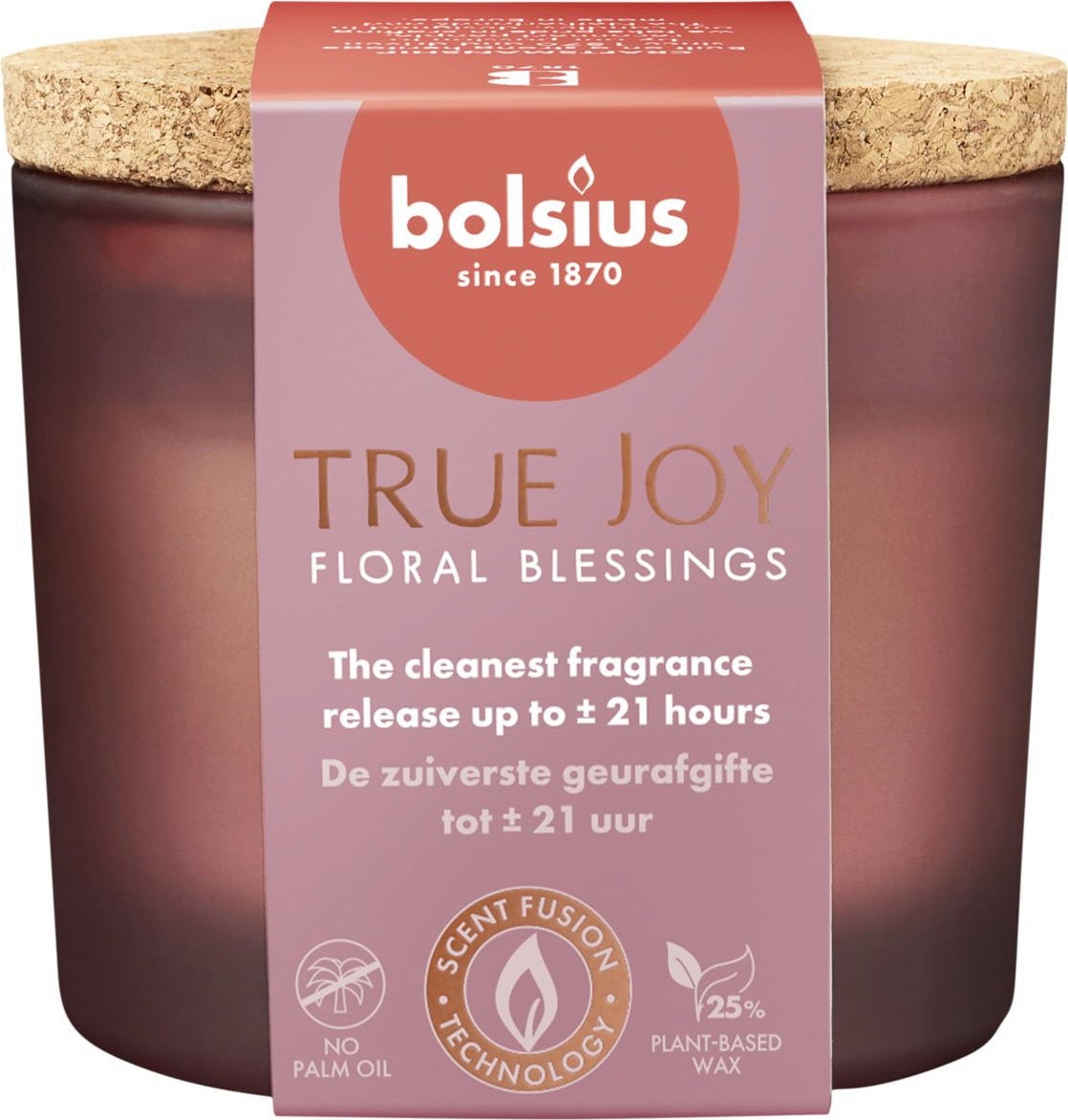 Daj się oczarować delikatnemu zapachowi świecy zapachowej True Joy marki Bolsius. Długotrwałe uwalnianie zapachu do 21 godzin zapewnia optymalną atmosferę dobrego samopoczucia w Twojej przestrzeni życiowej. Świeca jest wykonana częściowo z wosku roślinnego i nie zawiera oleju palmowego.