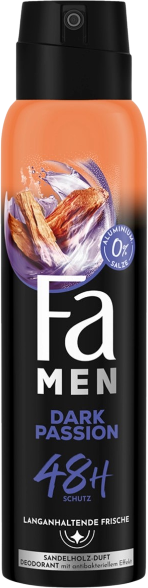 Niezawodna i długotrwała ochrona przed potem i przykrym zapachem ciała - dezodorant i spray do ciała Fa Men Dark Passion o zmysłowym, świeżym zapachu jest łagodny dla skóry i skuteczny przeciwko bakteriom powodującym przykry zapach. Wegańska formuła nie zawiera soli glinu i nie pozostawia śladów dezodorantu na ubraniach. Dla optymalnej ochrony przez cały dzień.