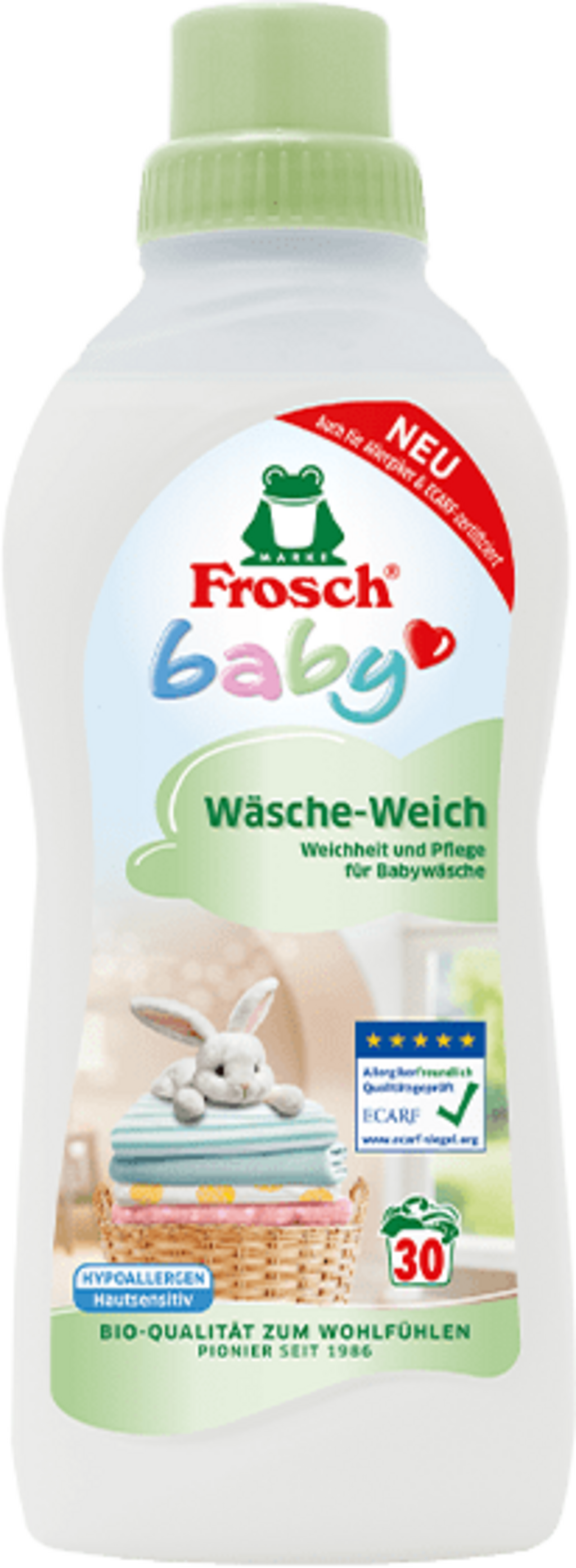 Płyn do płukania Baby firmy Frosch zapewnia cudownie przytulne pranie! Zachwyca hipoalergiczną formułą, która nie zawiera żadnych składników pochodzenia zwierzęcego ani barwników.