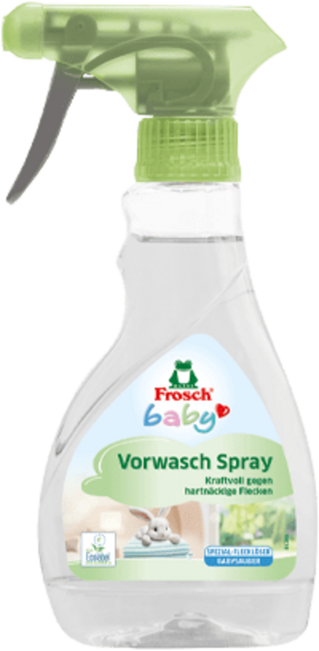 Spray - do prania wstępnego od Frosch usuwa skutecznie uporczywe plamy z tkanin niemowląt. Silny odplamiacz z cytrynianem (sól kwasu owocowego) jest wykorzystywany do prania wstępnego, aby otrzymać czyste pranie.