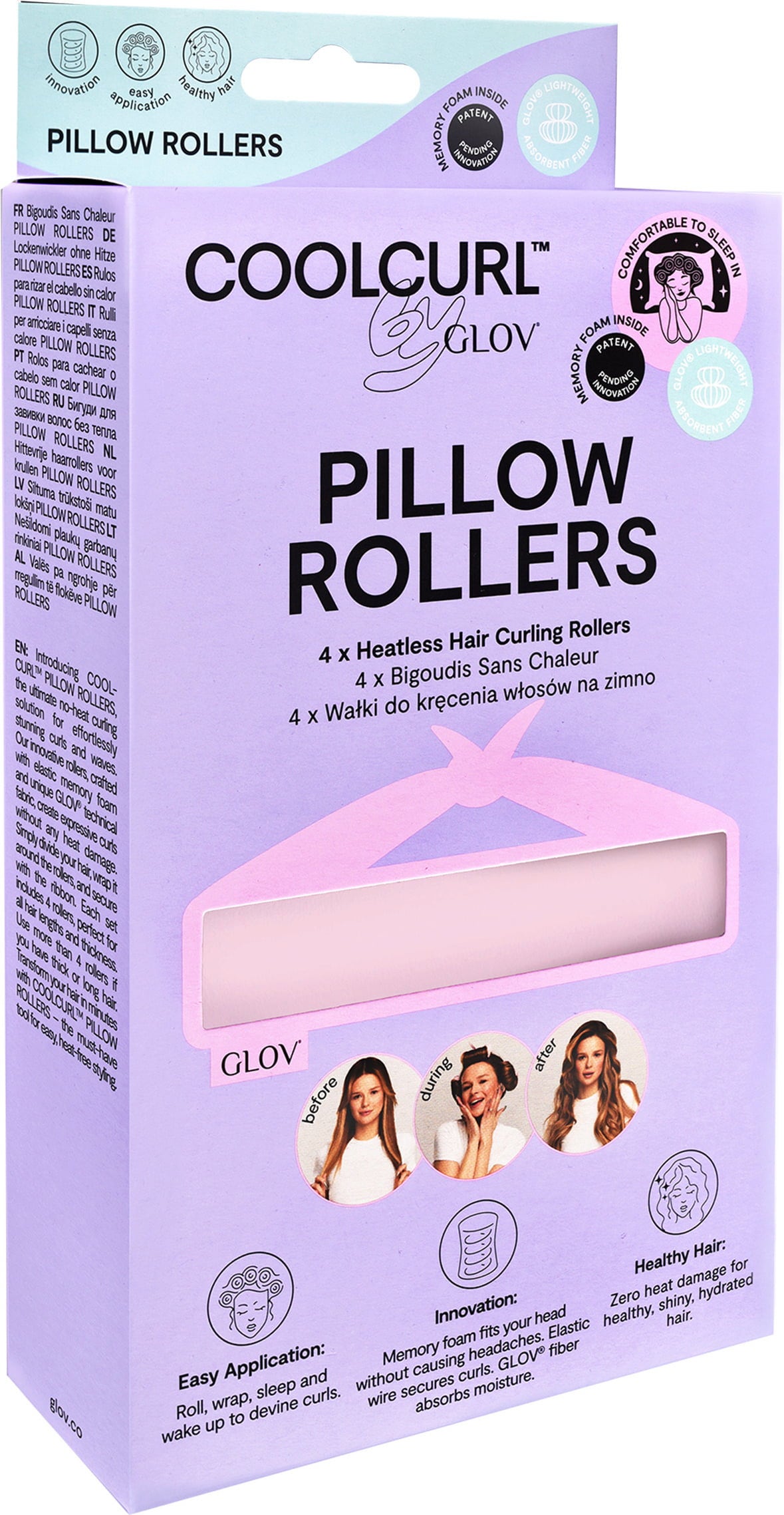COOLCURL™ Pillow Rollers to idealne rozwiązanie, aby uzyskać wymarzone loki i fale bez większego wysiłku i ciepła. Innowacyjne wałki wykonane są z wyjątkowo chłonnego włókna GLOV, pianki memory oraz dwóch ładnych kokardek. Ribbon Rollers są lekkie i zajmują niewiele miejsca, dzięki czemu zmieszczą się w każdym bagażu. Nadają się również do włosów dłuższych i gęstych, chociaż w przypadku włosów bardzo grubych lub bardzo długich zaleca się stosowanie dwóch zestawów.