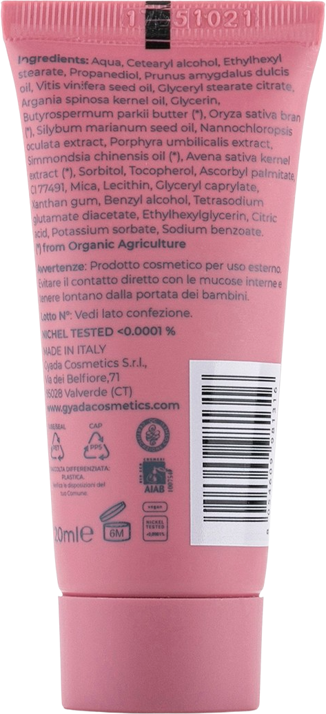 Aqua, Cetearylalcohol, Ethylhexyl Stearate, Propandiol, Prunus Amygdalus (Sweet Almond) Oil, Vitis Vinifera Seed Oil, Glyceryl Stearat Citrat, Argania Spinosa (Argan) Kernel Oil, Glycerin, Butyrospermum Parkii (Shea) Butter[1], Oryza Sativa Bran[1], Silybum Marianum (Thistle) Seed Oil, Nannochloropsis Oculata Extract, Porphyra Umbilicalis Extract, Simmondsia Chinensis (Jojoba) Seed Oil[1], Avena Sativa (Oat) Extract[1], Sorbit, Tocopherol (Vitamin E), Ascorbyl Palmitate (Vitamin C), CI 77491 (Iron Oxide), Mica, Lecithin, Glyceryl Caprylate, Xanthan Gum, Benzyl Alcohol, Tetrasodium Glutamate Diacetate, Ethylhexylglycerin, Citricacid, Potassium Sorbate, Sodium Benzoate