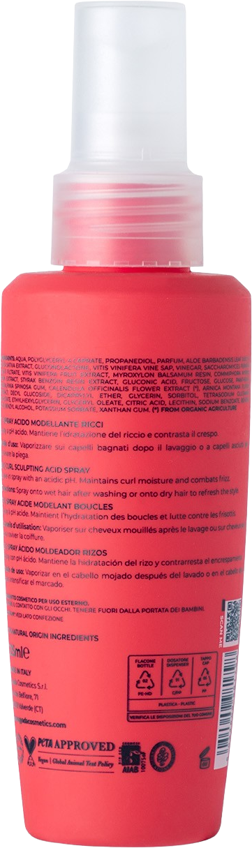 Spray o kwaśnym pH zapobiega puszeniu się włosów kręconych, a do tego pięknie podkreśla ich skręt i utrzymuje nawilżenie na odpowiednim poziomie. Organiczny ocet przywraca równowagę skórze głowy i wygładza powierzchnię włosów. Sok winogronowy i sfermentowana woda ryżowa uzupełniają recepturę o nawilżającą moc i zapewniają zadbany wygląd kręconych włosów.