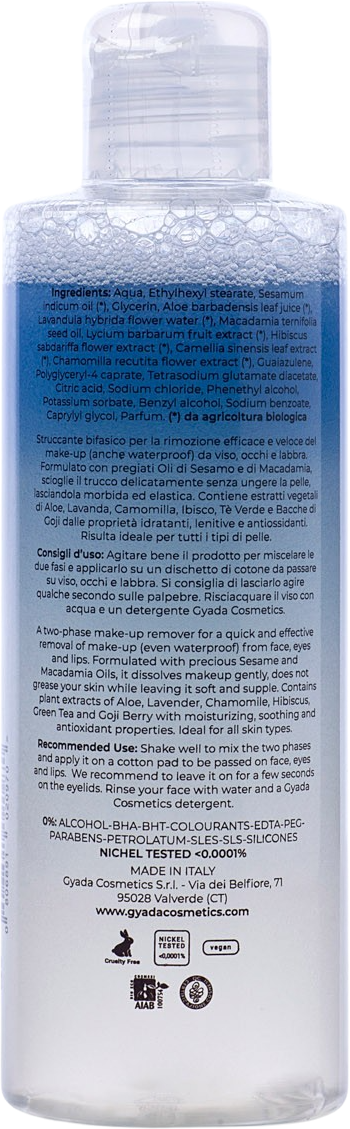 Dwufazowy płyn do demakijażu GYADA Cosmetics jest idealny do idealnego oczyszczania, a nawet usuwa wodoodporny makijaż. Działa szybko i skutecznie na twarz, oczy i usta. Delikatne oleje sezamowe i makadamia, rozpuszczają makijaż pozostawiając skórę miękką i elastyczną! Zawarte ekstrakty roślinne z aloesu, lawendy, hibiskusa, rumianku, zielonej herbaty i jagód goji mają działanie kojące, przeciwutleniające i ujędrniające. Świeży i delikatny produkt, idealny do codziennego użytku na wszystkich rodzajach skóry.