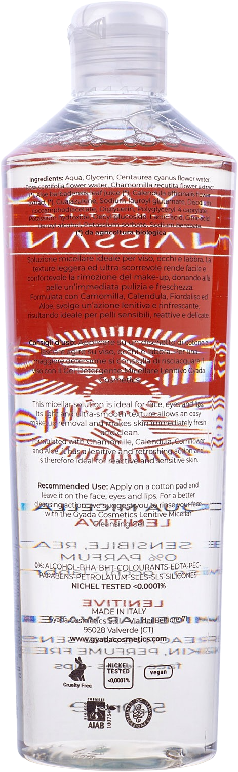 Dzięki zawartości bezzapachowej kompozycji i aktywnych składników nagietka, rumianku, bławatka i aloesu, ta micelarna woda GYADA jest idealna do oczyszczania wrażliwej i reaktywnej skóry. Pomaga usunąć makijaż i zanieczyszczenia z twarzy, oczu i ust, zapewniając jednocześnie odświeżenie.