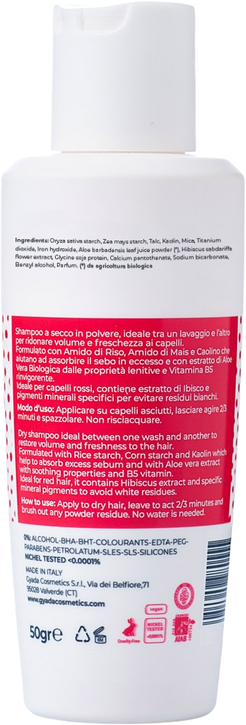 Dzięki ekstraktom z hibiskusa i specjalnych pigmentów mineralnych idealnie nadaje się do włosów rudych i zapewnia, że we włosach nie widać żadnych białych pozostałości. Suchy szampon ze skrobią ryżową i kukurydzianą oraz kaolinem pochłania nadmiar sebum. Odświeża włosy między dwoma myciami i nadaje objętość.