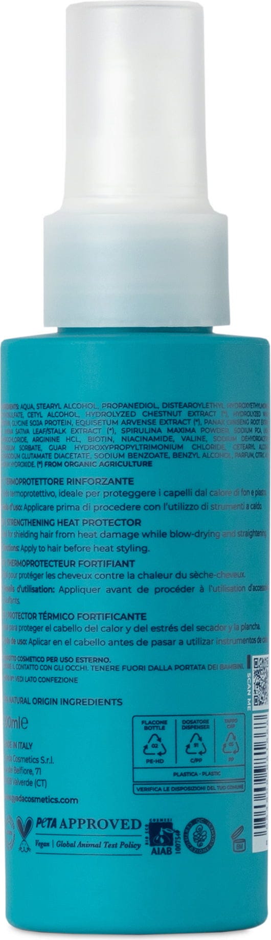 Formuła tego kosmetyku chroniącego przed gorącym powietrzem urządzen modelujących została opracowana na bazie spiruliny i AQ-Save - innowacyjnego składnika aktywnego, otrzymywanego z włoskich organicznych kasztanów. Składniki kosmetyku tworząt ochronny film na powierzchni włosów, a tym samym poprawiają równowagę nawilżenia - nawet jeśli włosy są narażone na wyjątkowo intensywne zabiegi modelowania z użyciem suszarki do włosów lub prostownicy. Produkt chroni włosy również przed szkodliwym wpływem środowiska, w szczególności elementów takich jak chlor, mrożny wiatr i woda morska. Preparat działa restrukturyzująco dzięki spirulinie, ekstraktom z owsa, skrzypu i żeń-szenia.