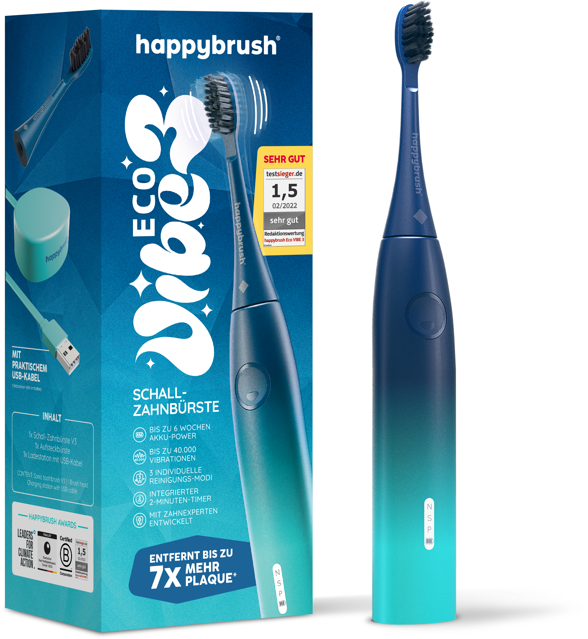 Ta elektryczna szczoteczka do zębów od happybrush zapewnia do 40 000 wibracji dzięki technologii sonicznej. Główka szczoteczki ma potrójnie skręcone włosie. Urządzenie może pochwalić się żywotnością baterii do sześciu tygodni. Szczoteczka oferuje trzy indywidualne tryby czyszczenia: normalny, delikatny i polerowania. Zintegrowany timer pomaga w równomiernym szczotkowaniu wszystkich kwadrantów. Dzięki blokadzie podróżnej produkt jest łatwy w transporcie.