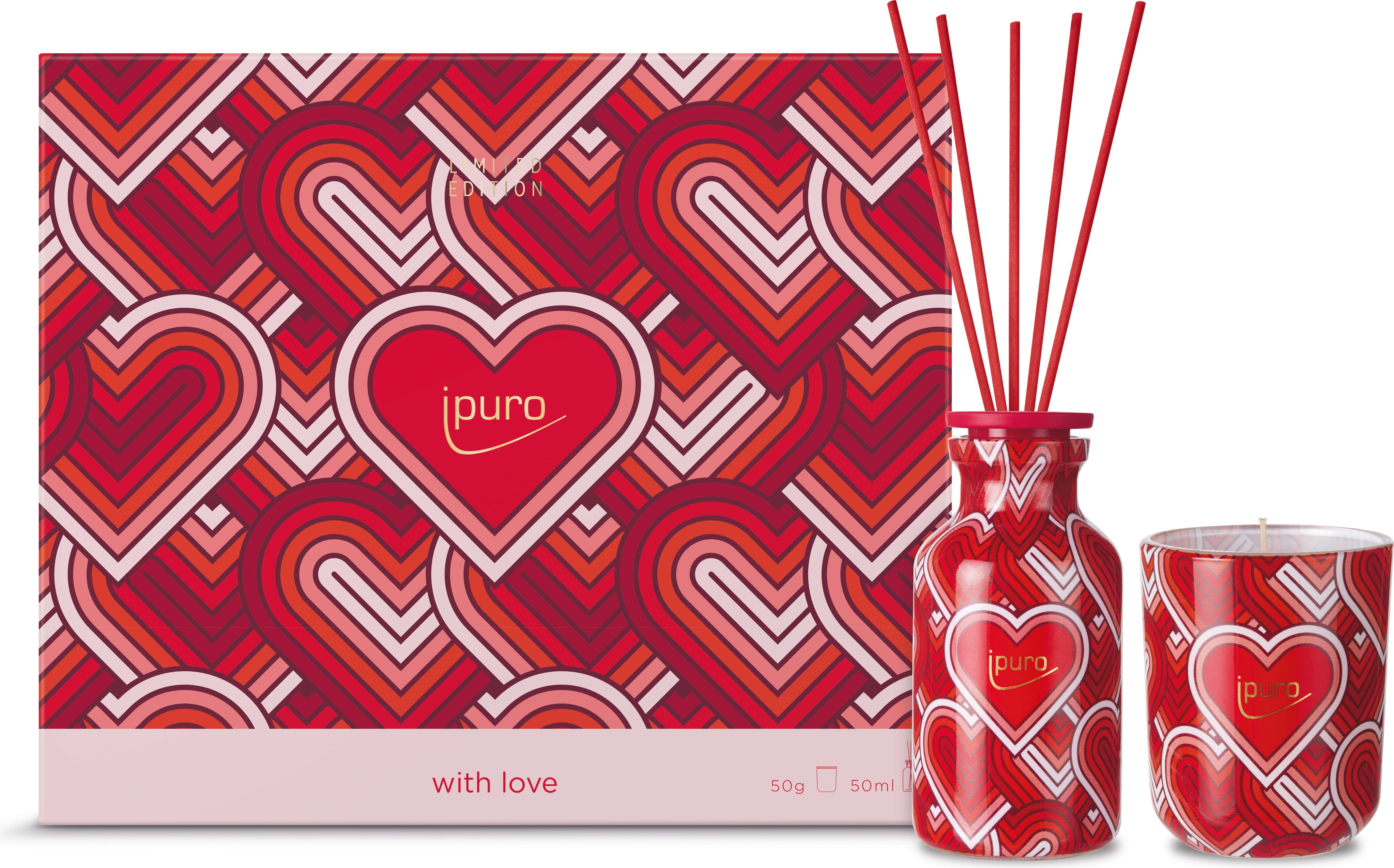 Zestaw zapachów do pomieszczeń With Love od ipuro zawiera zapach z patyczkami zapachowymi i świecą zapachową. Zestaw emanuje świeżym kwiatowym zapachem z nutami grejpfruta, cytryny, cyklamenu, jaśminu, róży, piżma i drzewa cedrowego.