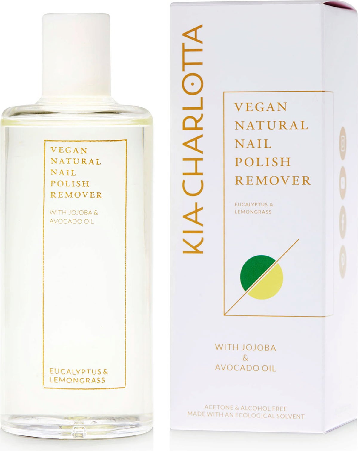 Ten naturalny lub wegański zmywacz do paznokci marki Kia Charlotta jest całkowicie wolny od acetonu i alkoholu i został wyprodukowany z ekologicznych rozpuszczalników. Skutecznie usuwa cały lakier.