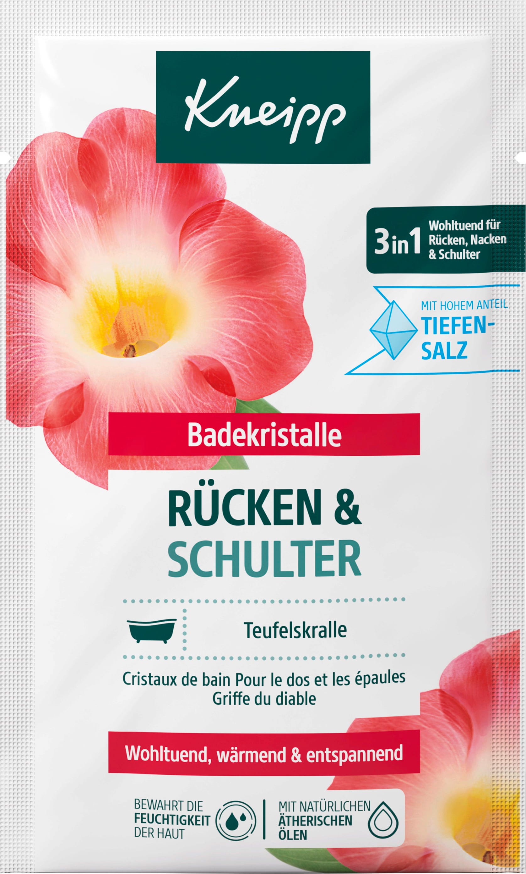 Kryształki do kąpieli pleców i ramion Kneipp emanują aromatycznym ziołowym profilem zapachowym wykonanym z naturalnych olejków eterycznych. Kryształki do kąpieli zawierają cenny ekstrakt z diabelskiego pazura i ziołowy, pikantny olejek eteryczny z kajeputu. Kryształki rozpuszczają się całkowicie podczas kąpieli.