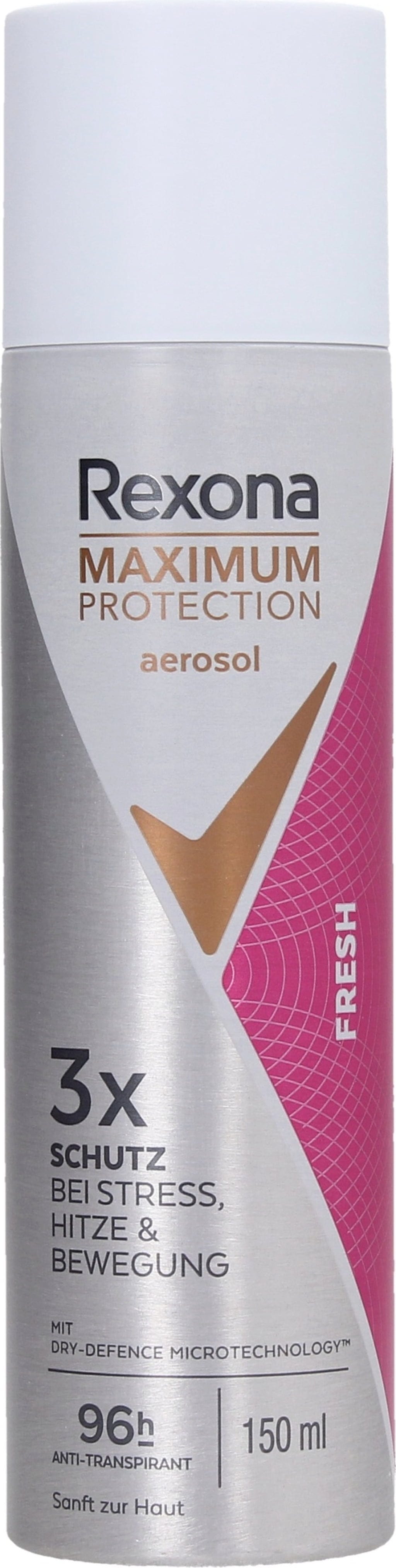 Dezodorant antyperspiracyjny w sprayu Maximum Protection Fresh od Rexona zapewnia potrójną ochronę podczas ćwiczeń, upałów i stresujących codziennych chwil. Dezodorant chroni przed niepożądanym zapachem potu do 96 godzin. Formuła nie zawiera alkoholu etylowego.