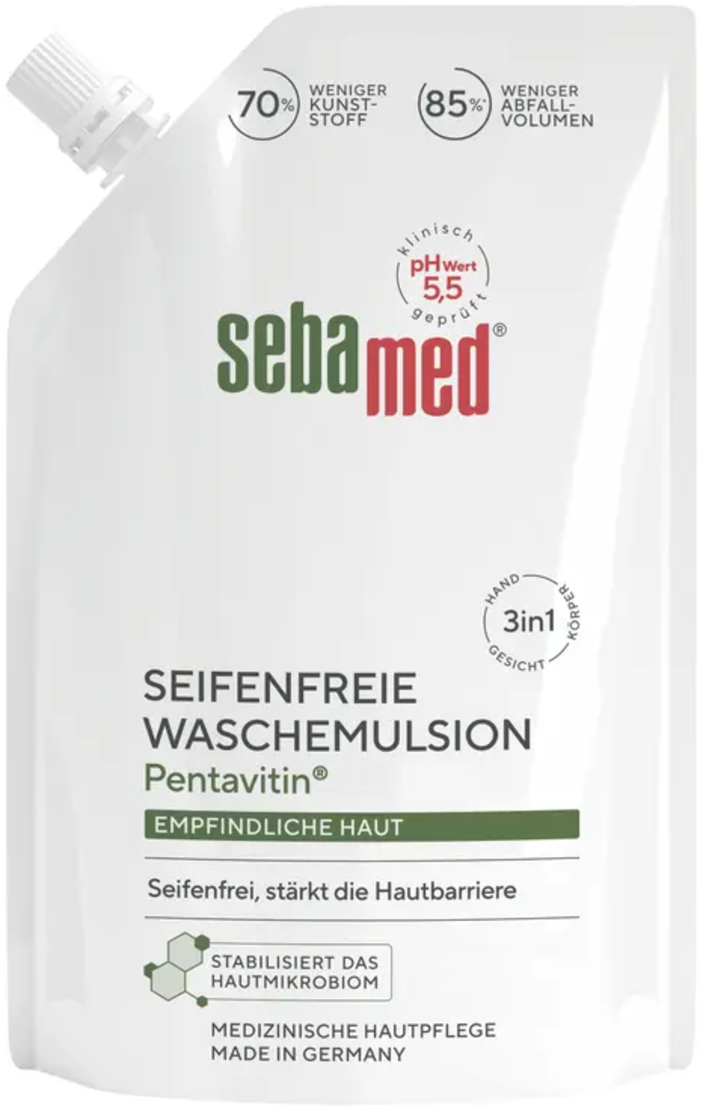 Emulsja do mycia bez mydła z Pentavitin® od sebamed oczyszcza wrażliwą skórę łagodnymi substancjami myjącymi. Pantenol i gliceryna tworzą również cenny kompleks pielęgnacyjny, który optymalnie wspiera skórę.