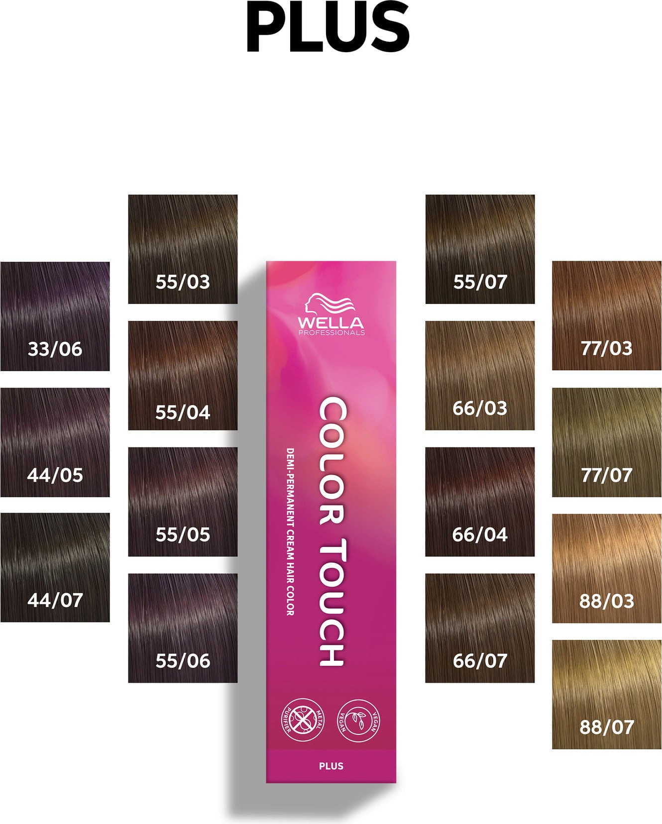 Color Touch Plus to półtrwała, intensywna farba zapewniająca olśniewający kolor włosów. Technologia Metal Purifier zapewnia wyjątkowo niezawodne rezultaty kolorystyczne – nawet w przypadku pokrycia siwych włosów. Wysoka intensywność koloru utrzymuje się aż do 28 myć włosów.