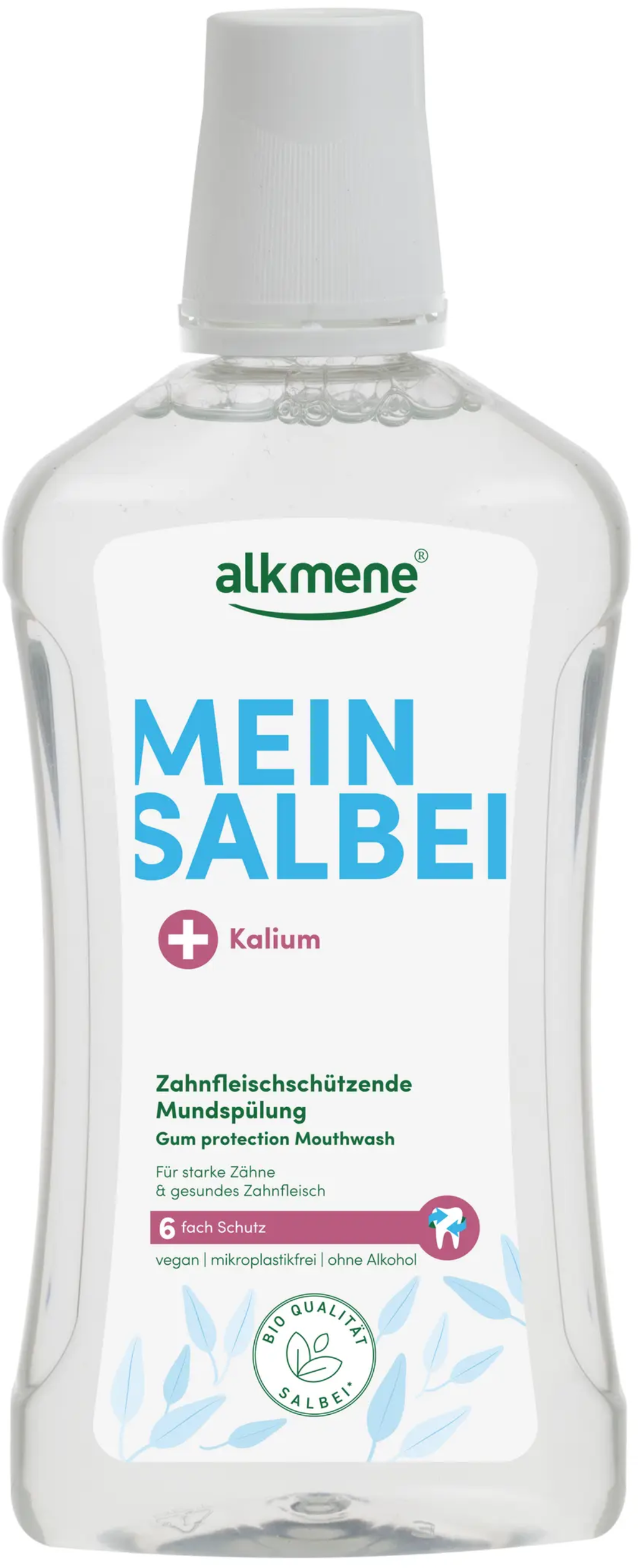 Płyn do płukania jamy ustnej My Sage od alkmene chroni zęby i dziąsła dzięki cennemu połączeniu szałwii, fluoru i potasu. Płyn do płukania ust jest wegański i wolny od mikroplastików i alkoholu.