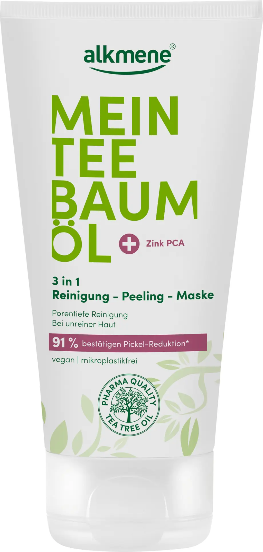 Ten płyn do mycia twarzy 3 w 1 od alkmene głęboko oczyszcza skórę dzięki pielęgnacyjnemu połączeniu olejku z drzewa herbacianego i cynku PCA. Płyn do mycia twarzy może być stosowany jako codzienny środek myjący, złuszczający lub maseczka. Niezawodnie usuwa ze skóry brud, martwe komórki naskórka, nadmiar sebum i makijaż. Formuła jest wegańska i wolna od mikroplastiku.