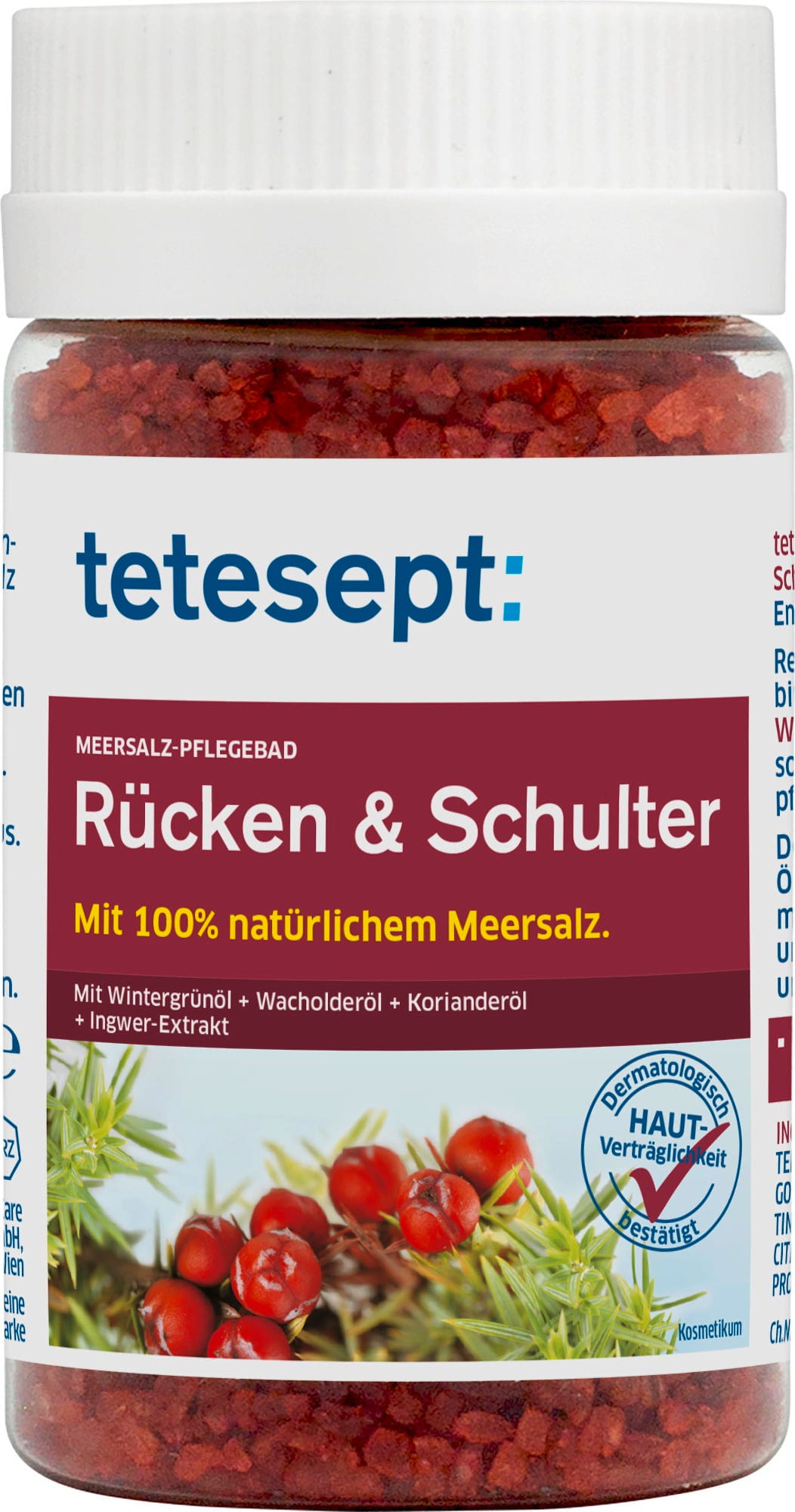 Długi, męczący dzień może mieć wpływ na całe ciało. Rozpieść swoje plecy i ramiona solą do kąpieli od tetesept! W 100% czysta, naturalna sól morska, naturalne olejki eteryczne z gruszyczką i jałowca oraz ekstrakt z imbiru zmienią Twoją wannę w idealne miejsce do relaksu i odprężenia.