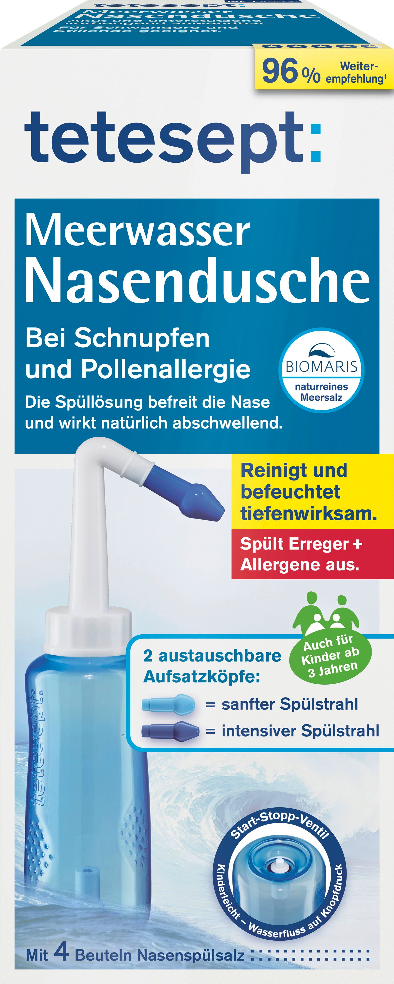 Dozownik do nosa z wodą morską tetesept jest przeznaczony do stosowania razem z roztworami do płukania nosa. Do wyboru są 2 nasadki (delikatny strumień do płukania lub intensywny strumień do płukania). Dzięki praktycznemu zaworowi start-stop można samodzielnie decydować o rozpoczęciu i zakończeniu płukania. w opakowaniu znajdują się 4 saszetki soli do płukania nosa. Pod nadzorem douche do nosa nadaje się również dla dzieci w wieku od 3 lat.