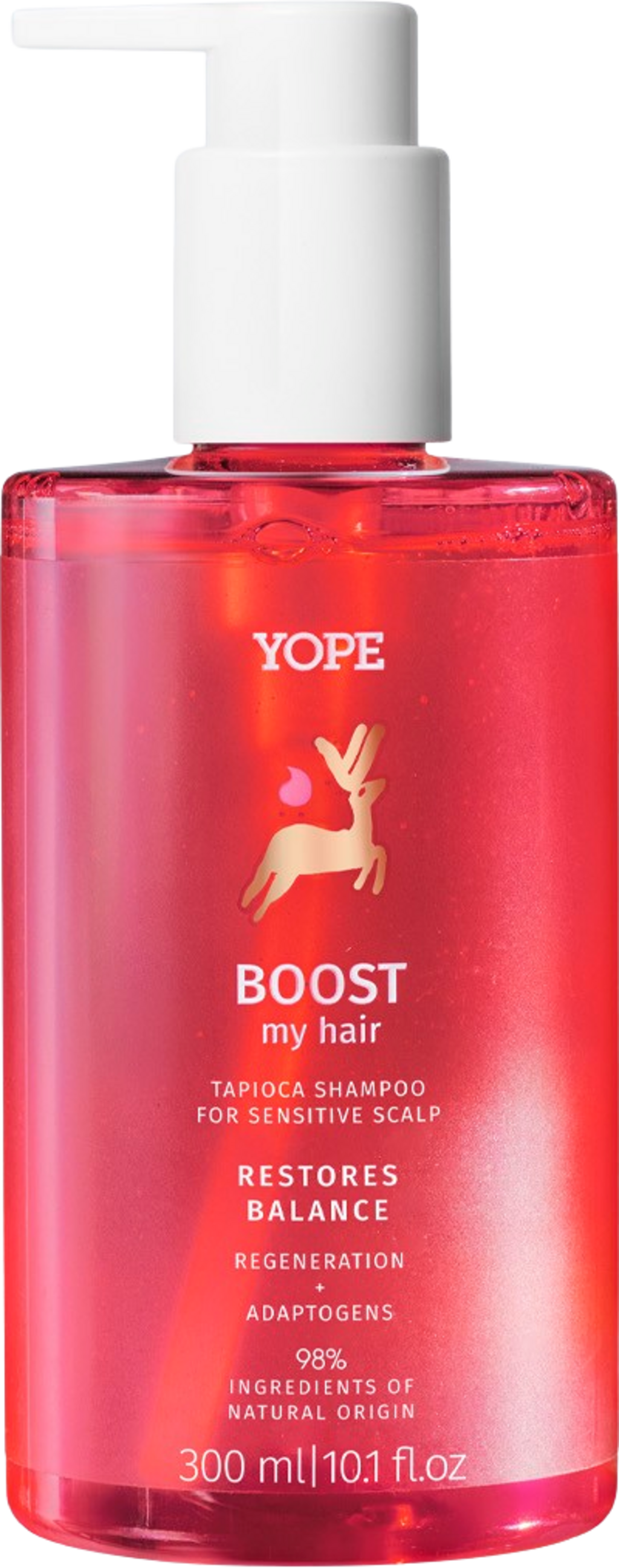 Balansujący szampon Boost My Hair Tapioca Shampoo od YOPE z tapioką i grzybkiem reishi przywraca włosom sprężystość i objętość! Dzięki zawartości sorbitolu i owsa odżywia skórę głowy, delikatnie oczyszcza i może zmniejszyć nadpobudliwość. Włosy zyskują objętość bez obciążania, stają się bardziej miękkie i łatwiejsze do rozczesania.